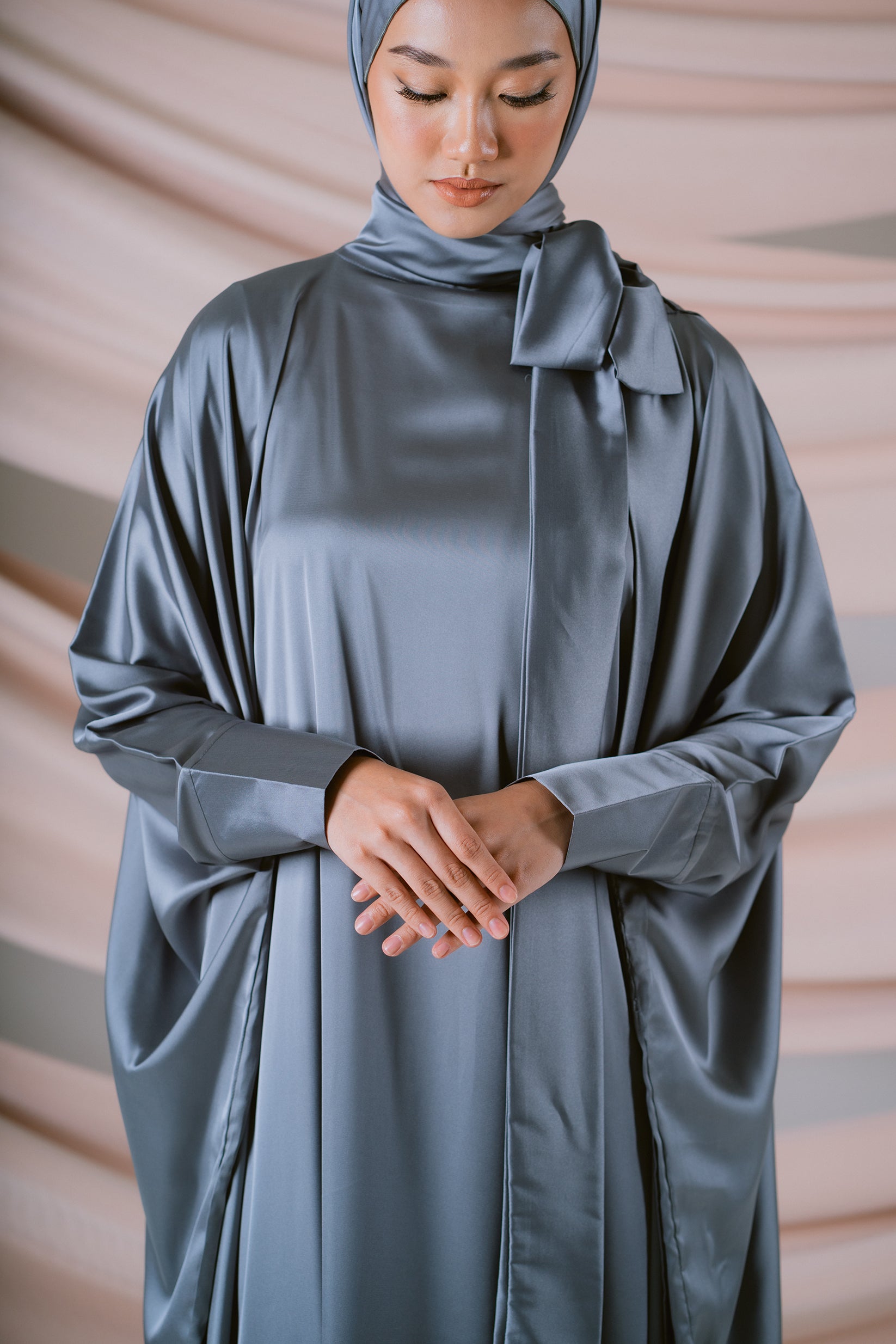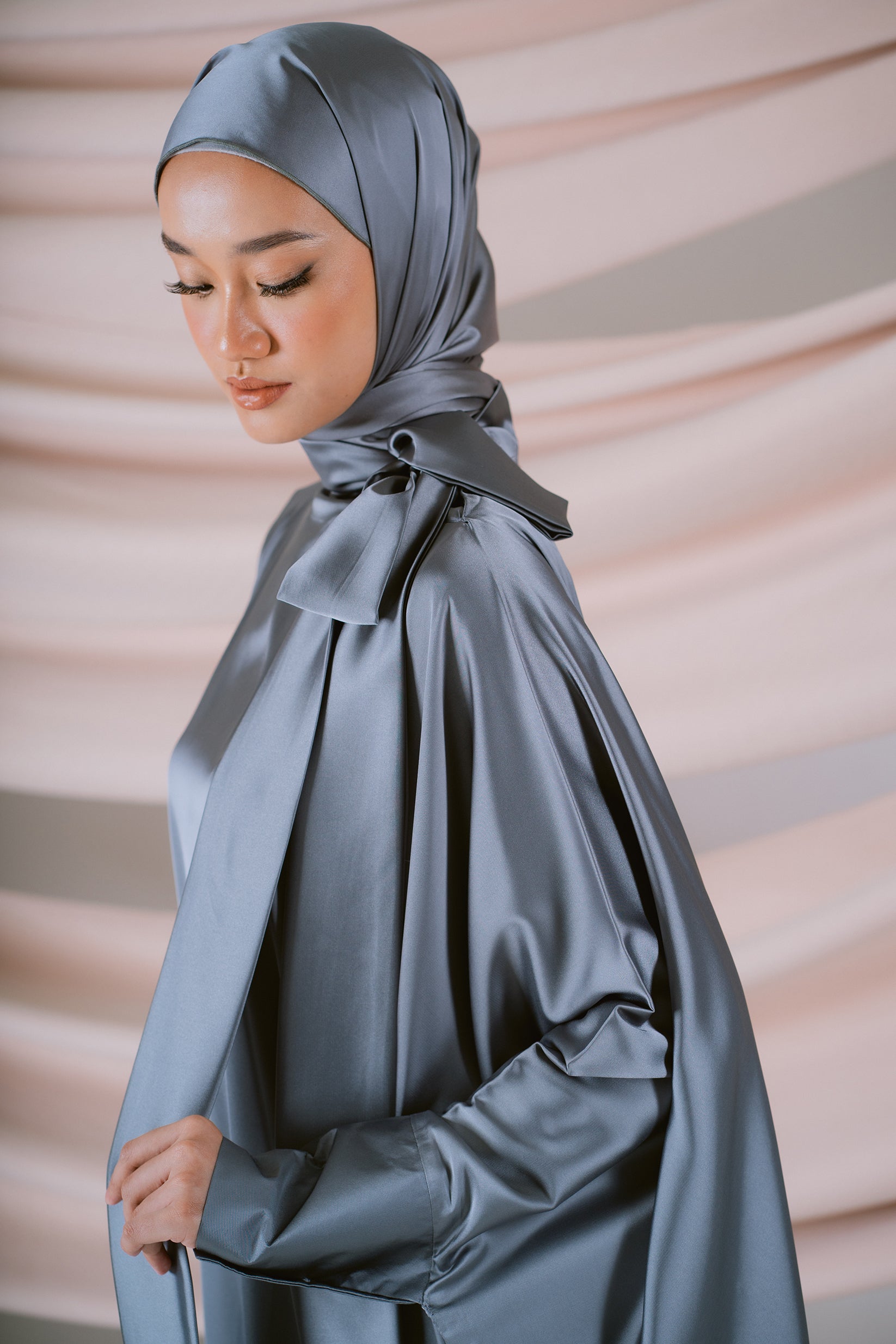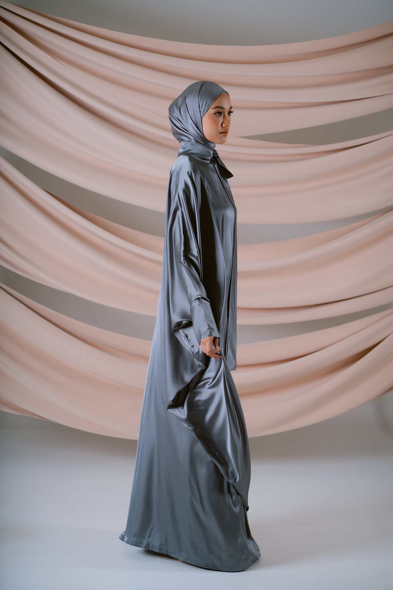 Cool and captivating, Argente reflects the quiet brilliance of silver light. Crafted from fluid silk satin, its oversized silhouette glides effortlessly, catching the glow with every movement. The high neckline and subtle ribbon detail at the side add a refined structure, while buttoned sleeves ensure wudhu-friendly ease. Completed with a matching satin shawl, Argente embodies modern grace — sleek, timeless, and luminously soft.