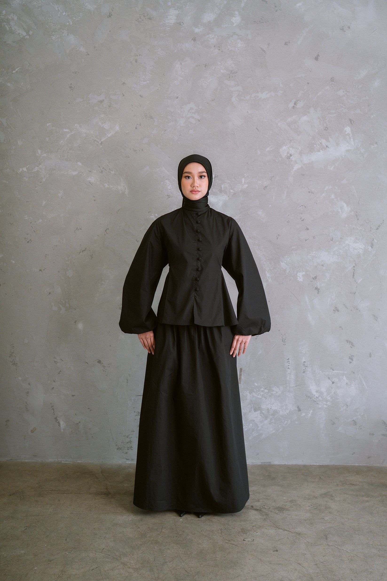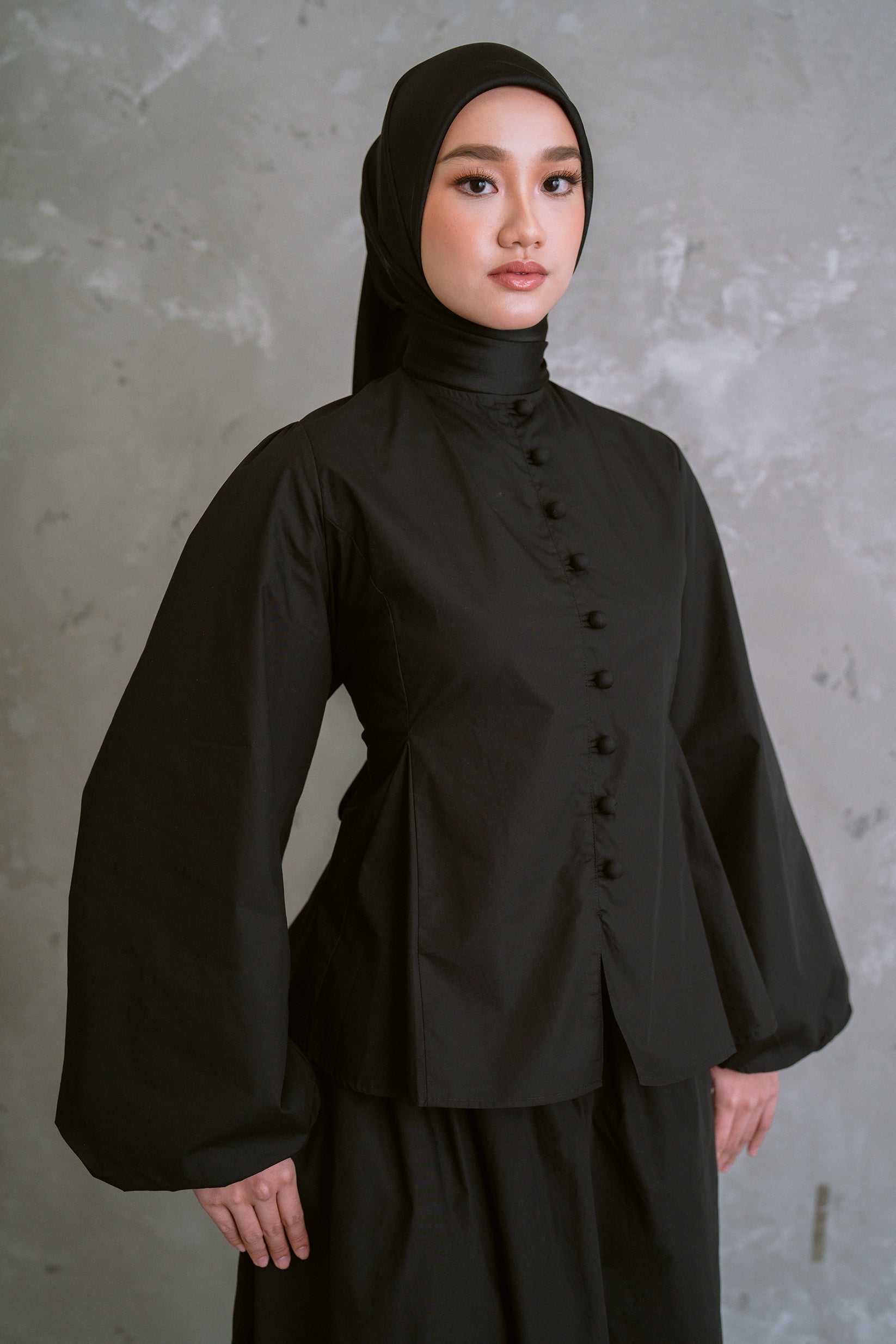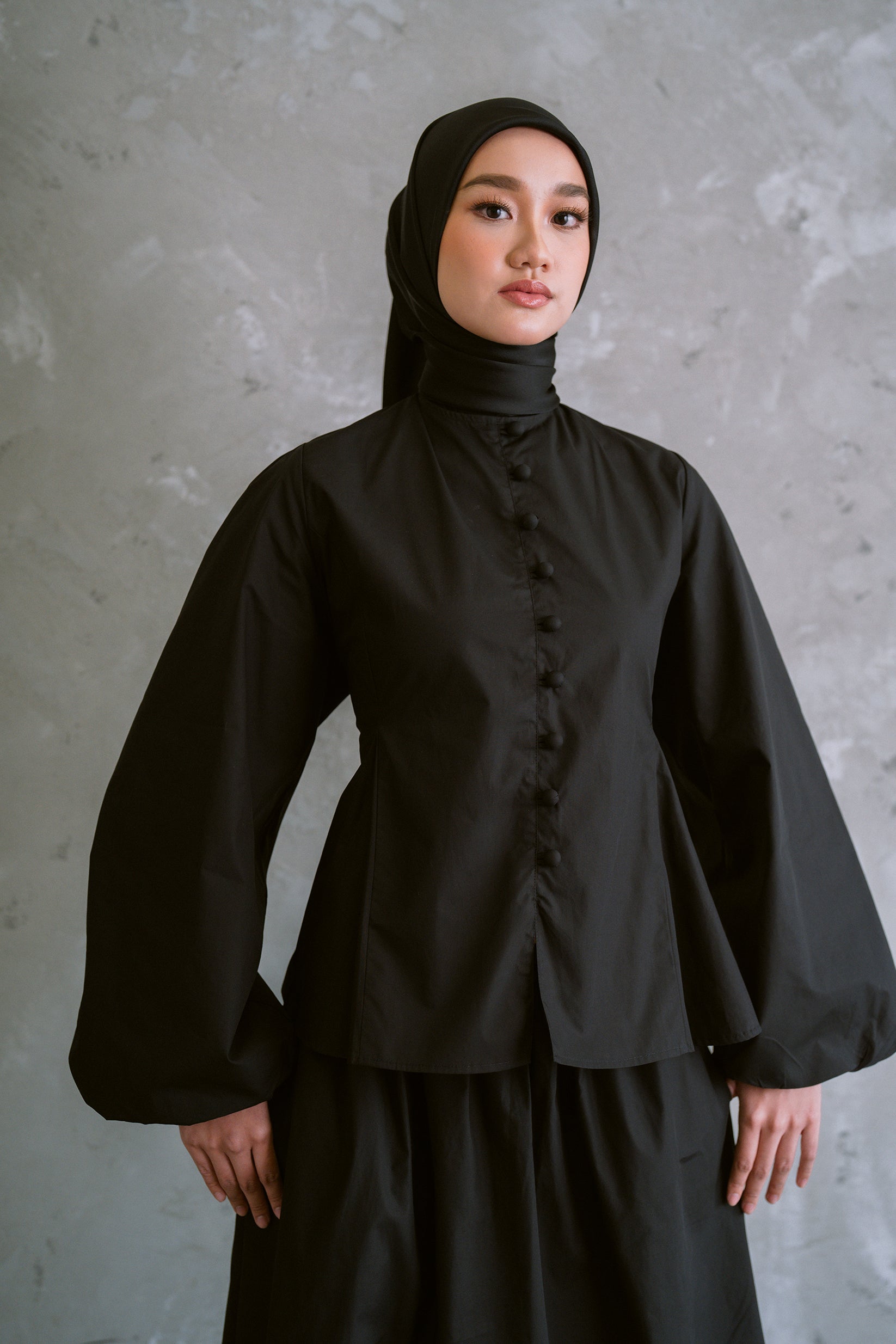 Crafted from premium poplin cotton, the top features a modest high neckline, soft balloon sleeves and our signature adjustable tie-back, allowing you to define your shape with ease. Finished with a row of covered, non-functional buttons, Luna in Black delivers elegance through simplicity.