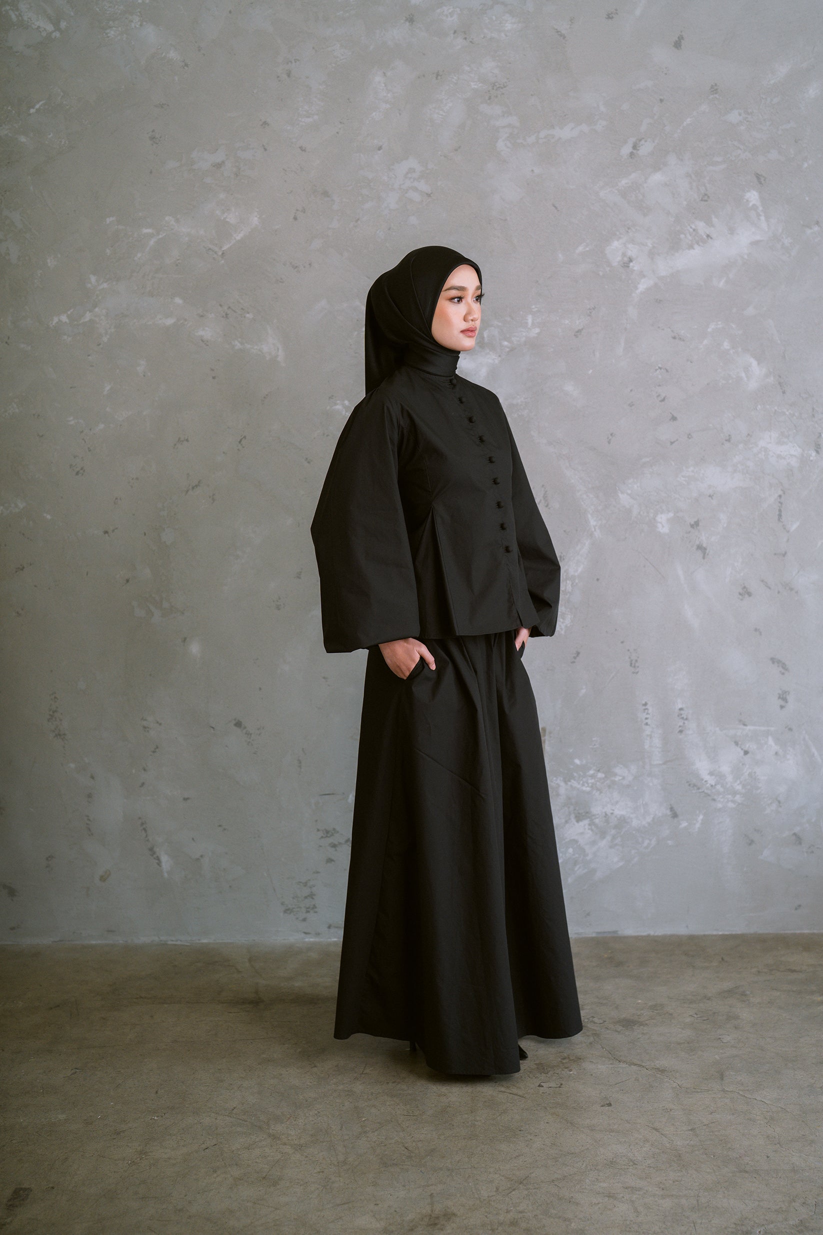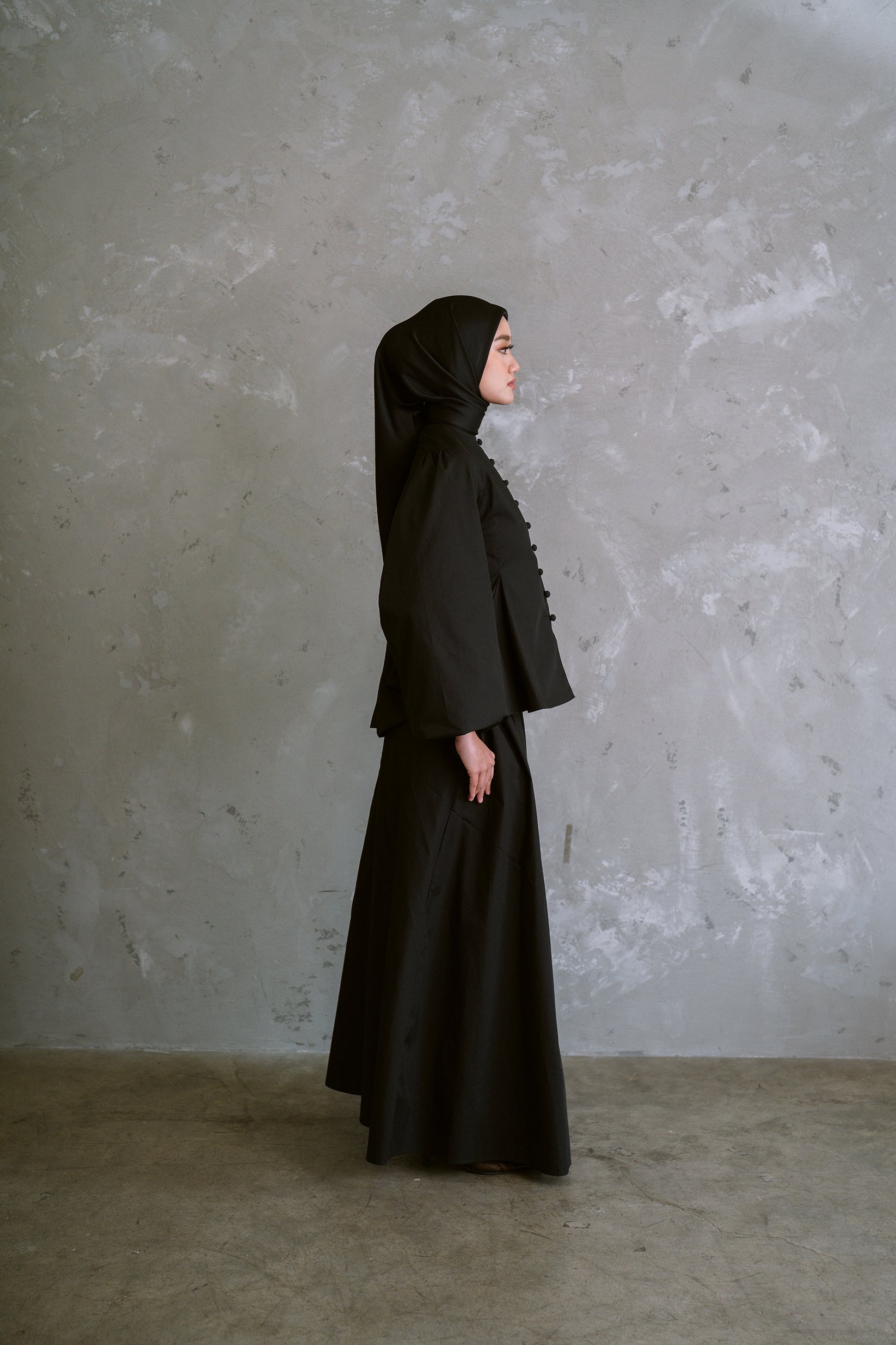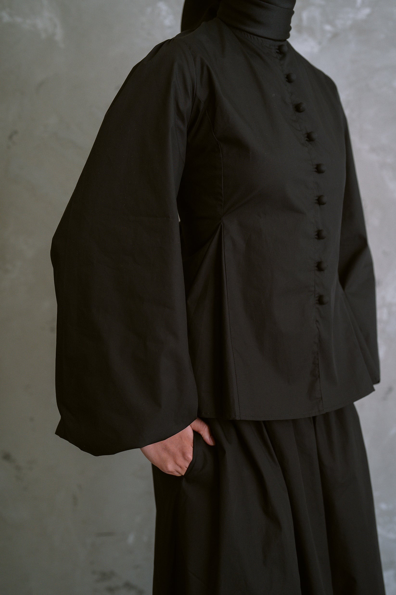 Crafted from premium poplin cotton, the top features a modest high neckline, soft balloon sleeves and our signature adjustable tie-back, allowing you to define your shape with ease. Finished with a row of covered, non-functional buttons, Luna in Black delivers elegance through simplicity.