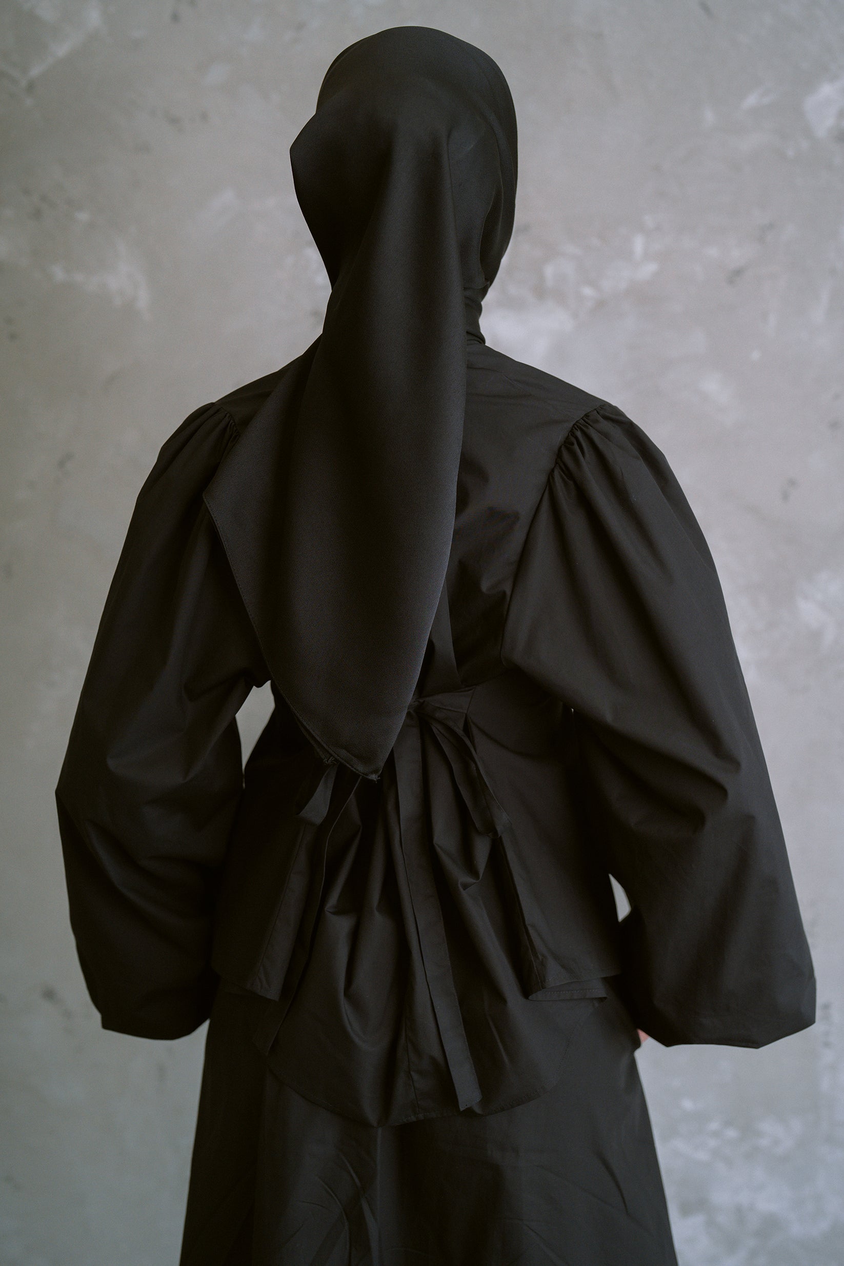 The Luna top features soft balloon sleeves — gently voluminous from shoulder to wrist — creating an elegant, airy silhouette without added bulk. The sleeves finish with a comfortable elastic cuff, allowing them to fall naturally while keeping the shape structured and modest. This design adds movement, femininity and a subtle statement to the entire look.