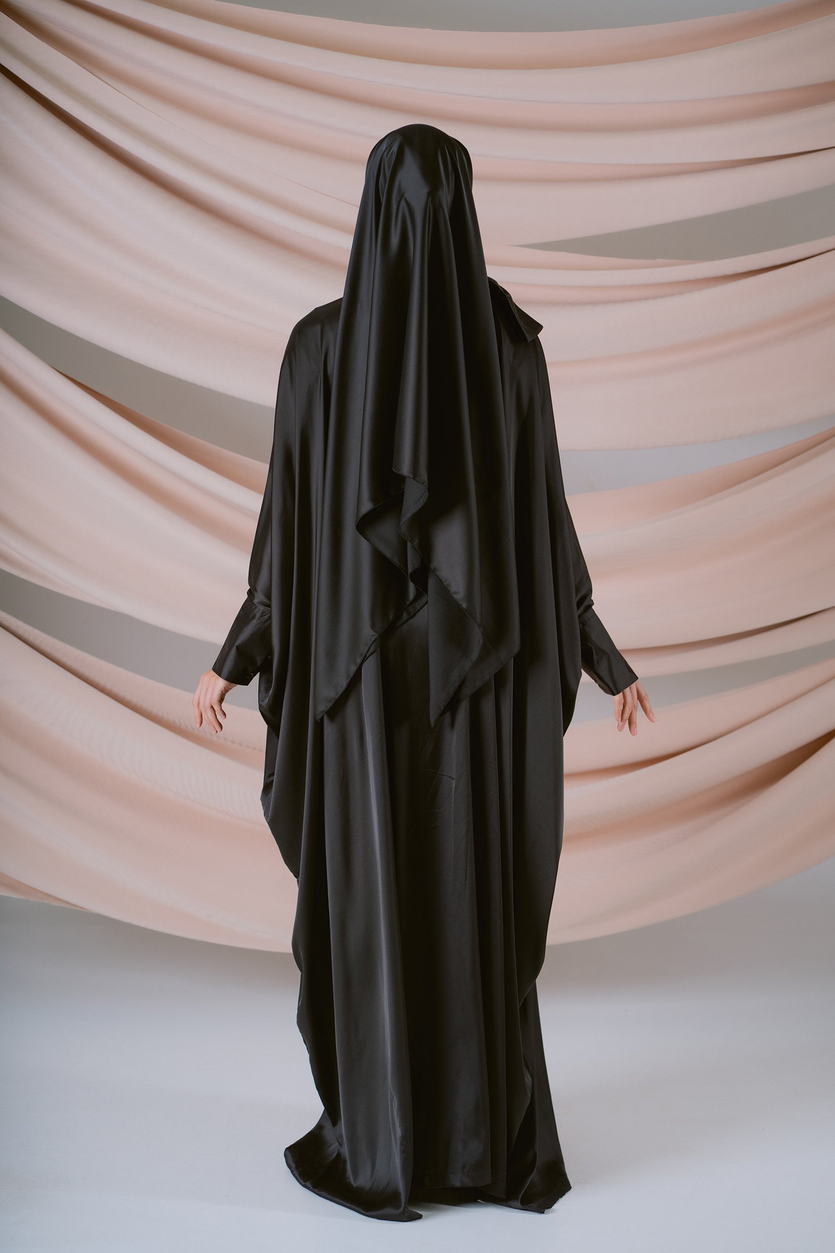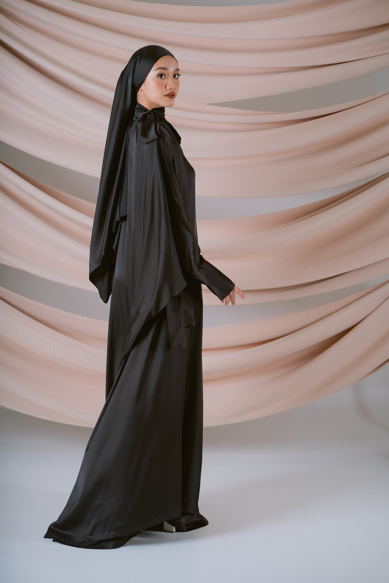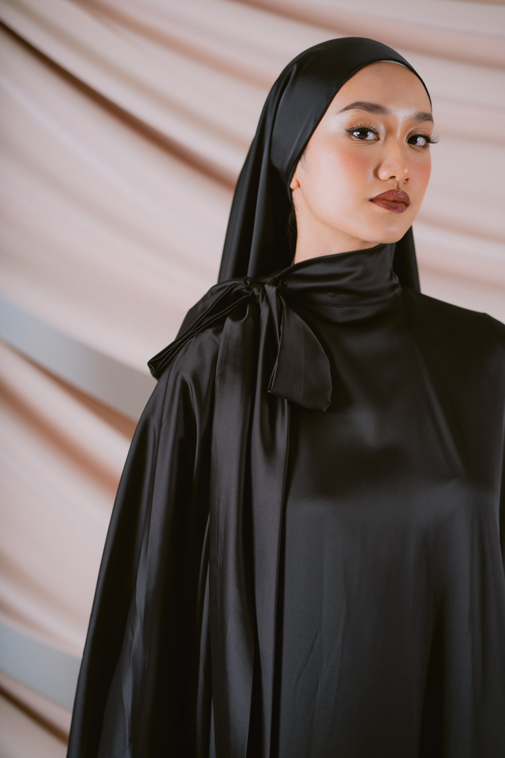 Dark, fluid, and endlessly refined, Nocturne embodies quiet power and timeless allure. Crafted from sumptuous silk satin, its oversized silhouette moves with effortless grace, while the high neckline and ribbon detail at the side lend a sculptural elegance. Thoughtfully designed with buttoned sleeves for wudhu-friendly ease and paired with a matching satin shawl, Nocturne captures the essence of sophistication — bold yet serene.